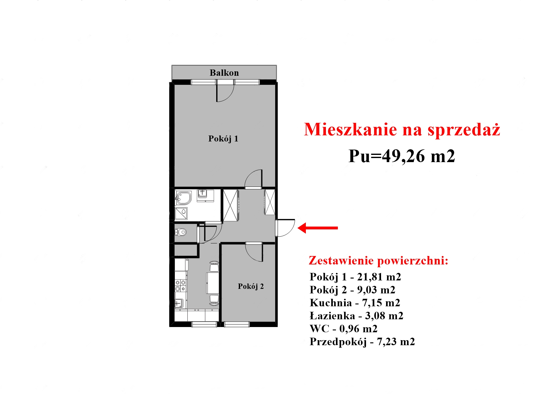 - 49,26 m2 powierzchnia użytkowa mieszkania ( 51,87 m2 z piwnicą 2,61 m2)