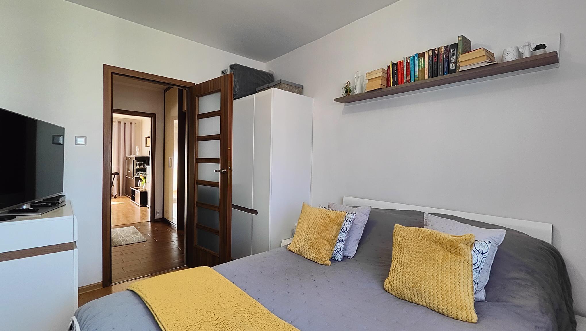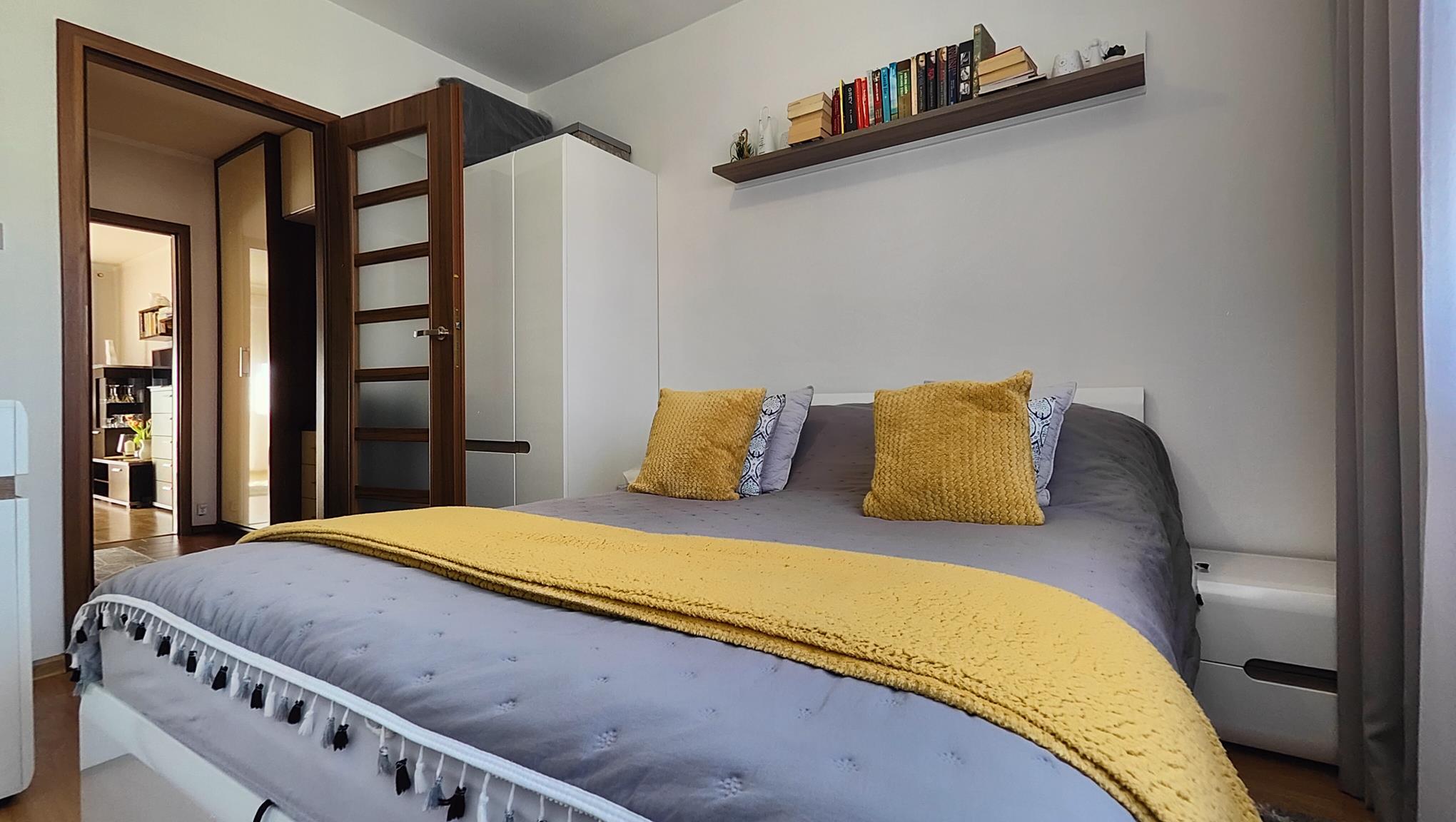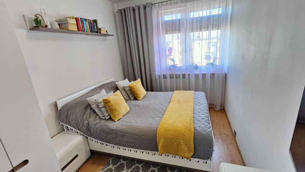 Przytulna, w pełni wyposażona sypialnia (9,03 m²) to idealna przestrzeń do wyciszenia.