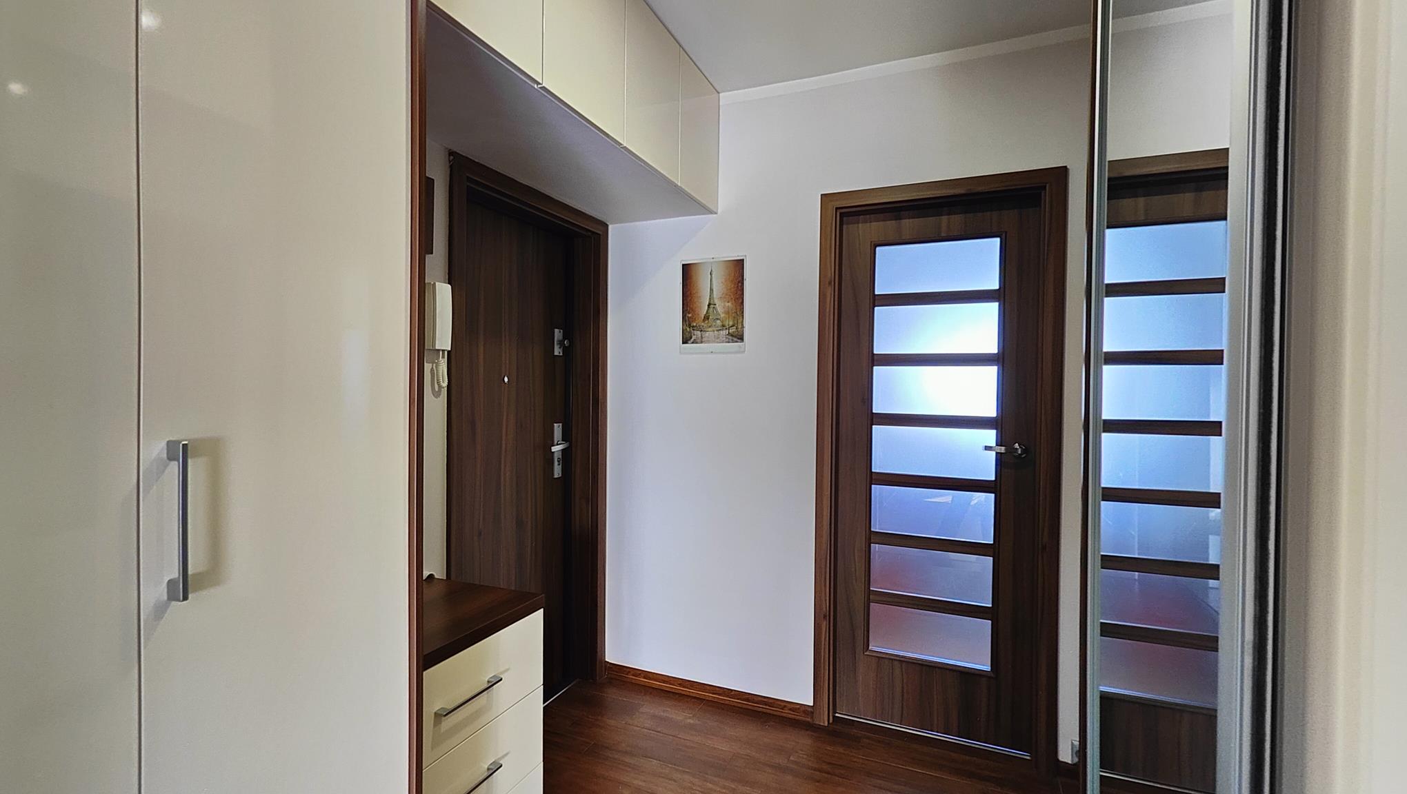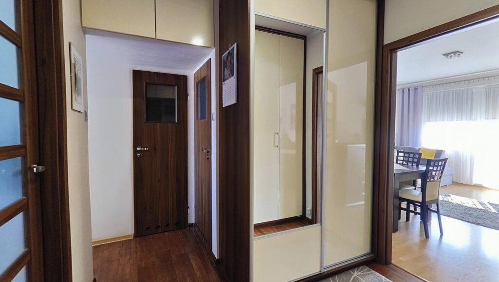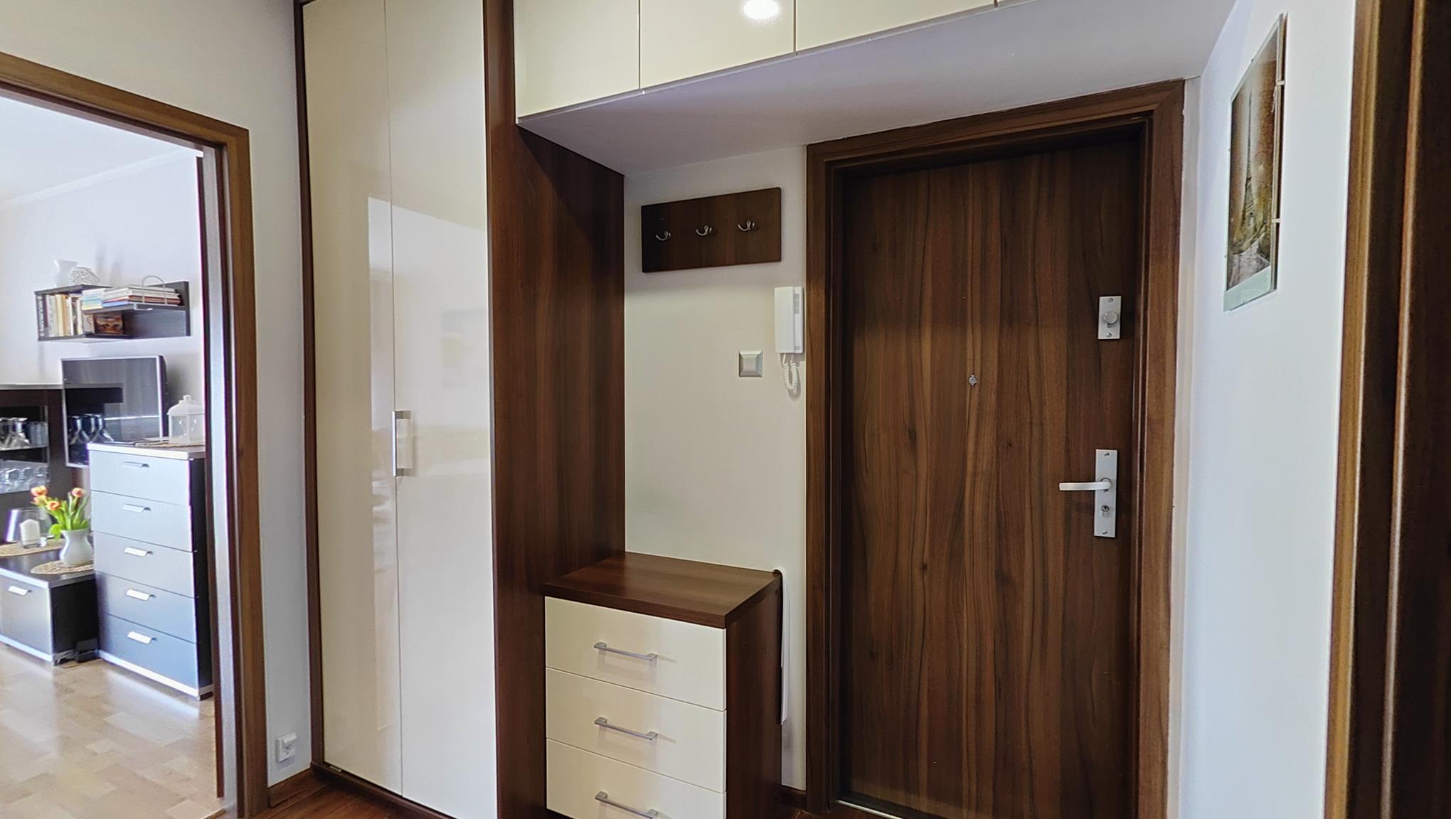 Przemyślane zabudowy w przedpokoju, w tym dwie pojemne szafy oraz komoda, zapewniają wygodę i porządek każdego dnia.